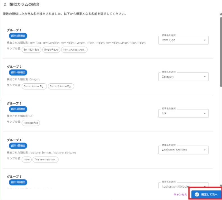 類似カラムが検出されるので、基準となる名前を選択してください。