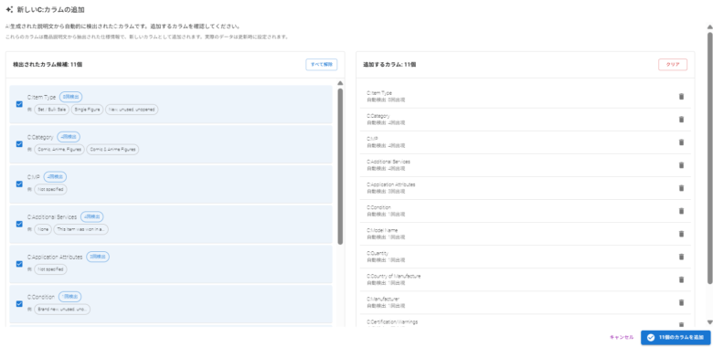 商品情報をもとに、Item Specificsの新しいカラムを自動で作成し、内容も自動入力できます。