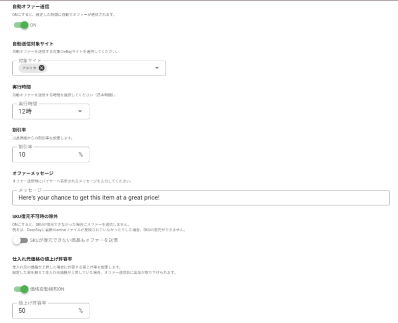 スケジュールの重複にご注意ください。同じ価格帯で複数のスケジュールが重複した場合、eBayに最初に到達したマークダウンが適用されます。どちらが先に適用されるかは保証できないため、価格帯が被らないように管理することをおすすめします。