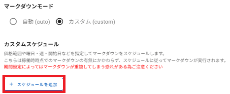 、カスタムモードでは価格帯ごとに異なる割引率を設定し、曜日・週・日付を指定してスケジュール化できます。
