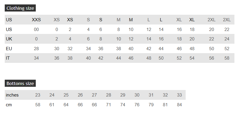 eBay公式サイトにも以下のようなサイズ表が掲載されていますので、参考にしてみてください。