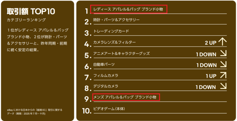 実際にeBay Japanの2025年第3四半期 越境ECレポートでも、アパレルは取引額ランキング上位にランクインしています。