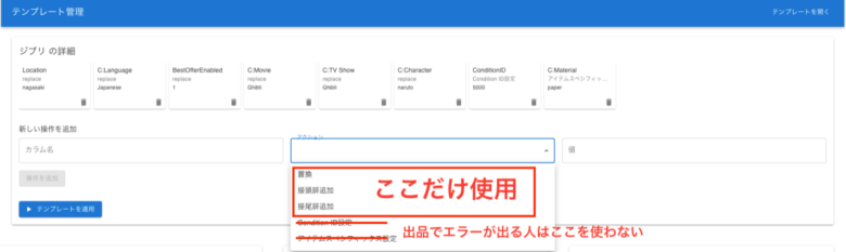テンプレートの一括変更の時に、 真ん中のアクションで、 置換ではなくCondition ID設定やitemspecifics設定を使ったのかもしれません。 これはもしかしたらこちらの不具合の可能性あるので、真ん中のアクションは置換だけを使ってみてください