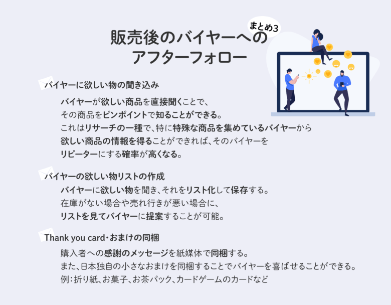 日本人の丁寧な対応や小さな心遣いは、海外のバイヤーに高く評価されることが多く、他店との大きな差別化につながりますよ。